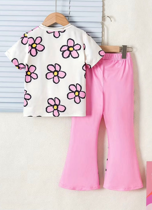 Girls' Floral Print Round Neck Short Sleeve T-Shirt with Solid Color High-Waist Textured Wide-Leg Pants 2pcs Set